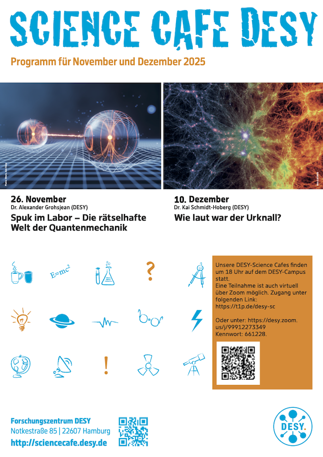 Das Science Café am 26.11.2025 findet um 18:00 am DESY in Hamburg im Seminarraum 4. Der Sprecher befindet sich vor Ort am DESY. Es gibt zur Zeit viele Baustellen und Umleitungen auf dem DESY Campus. Bitte fragen Sie am Eingang nach dem derzeit besten Weg zum Veranstaltungsort.
